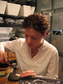 2002 was a year of creative experimentation and the development of refreshingly new designs that would soon become Erin May jewelry. Erin set up shop at home and began working with vintage mother of pearl and abalone buttons. She cut them, carved them, stacked them and set tiny semiprecious stones on top of them. She enjoyed giving the buttons a new life with a new purpose- to be admired for their beauty and not for their utility. Other materials soon crept into the design process, as rayon fibers were woven through silver bezel cups and silk ribbon was hand knotted into beautiful choker necklaces. She incorporated a mix of chains into her designs and played with various methods of oxidation that would give her work an aged patina. She began using raw diamonds, photography and engraving as a means to communicate through her work. Everything fell into place and Erin May jewelry was launched in 2003. It was and is a time of work.